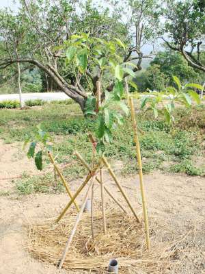 1.種植黃金果樹苗時加3支Y叉樹枝支撐,今見3樹枝變成7支新竹竿,主幹&小枝都五花大綁(如下圖),再看百香果苗土是濕潤的,可想而知好心人是誰。