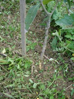 2.前幾次割草割掉黃金葛、棕竹等,日前O園雇工割草也割掉了咖啡、土黃皮苗等,今還是自己小心割,半天割約250坪,仍割掉許多埋藏於雜草叢中之瓜芽,最難過是把芒果環狀剝皮(下圖)。