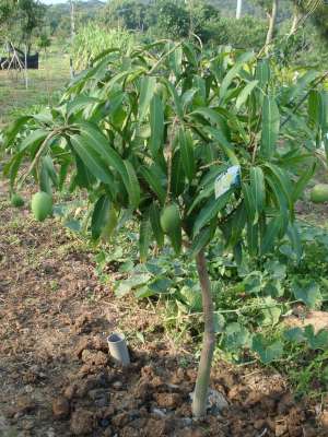1.日前割草把芒果環狀剝皮,專家教導趕緊將上方樹皮切一條移植補皮接通上下,因自己接枝尚無存活記錄,改當壓條法處理,挖起另種深一點泥土蓋過剝皮處,試看是否可再長根,原位置種新品種金蜜芒果(1.75"X1200元),已結有雞蛋大芒果8粒 (下圖)。