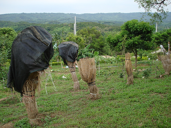 2.種於大樹下之油茶樹少受烈日狀況還好,露天無遮蔭之油茶樹嫩枝芽許多枯萎了,甚至樹皮乾焦剝落木裂開,有一棵可能已完全枯死(立德街的油茶樹也是皮焦木裂枯死了)。專家指示無遮蔭者,先用粗鐵絲固定於樹幹為支架,拆下無效之防風牆遮陽網鋪蓋於支架上,亡羊補牢希望能重現生機。