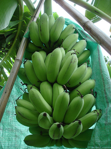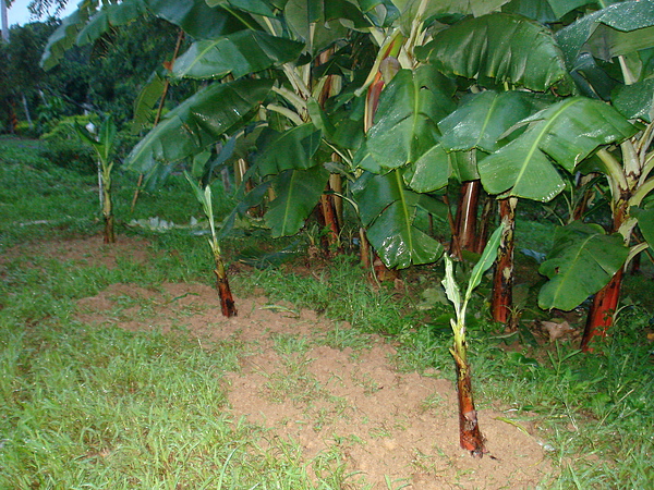 去年九月女婿幫忙種七株矮蕉,因想多繁殖些所以分孽芽均未割除,如今每叢都有分孽2-3子芽,新芽大小已適合分株,每叢留本株及備接代芽,其餘挖出另種,一株種O園六株植於蕉圃區四周,現有大小矮蕉卄株,陸續開花結果一年到頭都可有蕉吃。