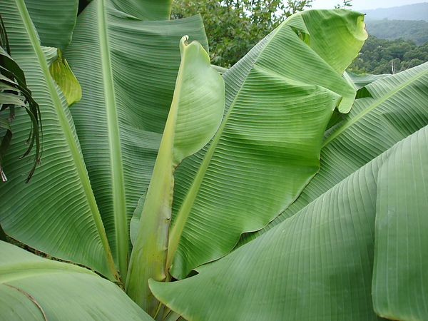 順便檢查芭蕉,居然蕉尾撐破護袋,剪開編織袋看到蕉果渾圓肥碩,比市售芭蕉還大些呈淺綠色,五月底割蕾至今已近百日,按書上說:割蕾百日後成熟叢上黃。