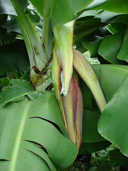 到蕉圃工作才發現兩株矮蕉有花苞了,一蕾已彎垂,一蕾剛由頂心冒出,由上向下照張剛伸出頭之花苞分享網友,這也是矮蕉的優點,其他蕉種想看也看不到的鏡頭,矮蕉的花蕾比芭蕉蕾大些,並且蕉蕾彎向上坡側,多留幾掛蕉果有觸地之慮。