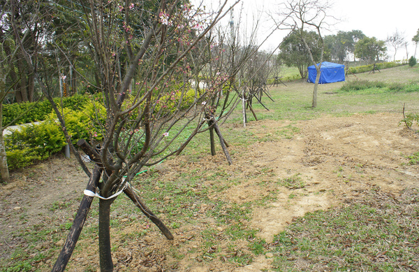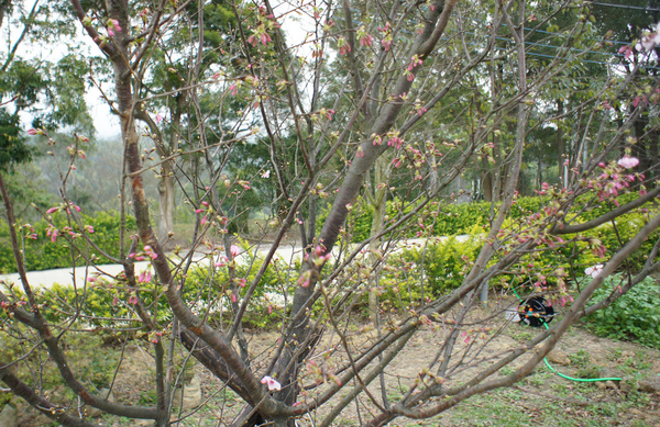 N園吉野櫻待放紅蕾滿樹,也有早開花零星點綴其間,五枚花瓣在花朵剛綻放時是淡紅色,而在完全綻放時會逐漸轉白帶淺粉紅清秀亮麗,預估下周陸續盛開,林園主特地搭起帳篷把握賞花時節。各方老同學三月12分從舊金山.大理.台北.高雄齊聚春天,屆時正逢櫻花怒放,繽紛花景令人驚豔,借花獻佛彌補沒水果招待之遺憾。