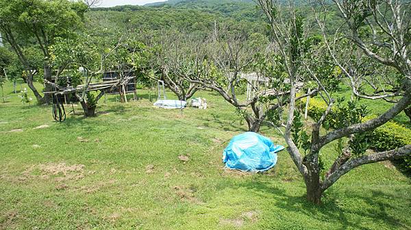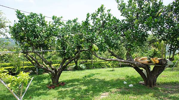去年結果樹都在西南角,我的解釋是:開花期正逢東北季風,但今年西南角未死的也無果,不知該如何自圓其說。今年開花期乾旱致授粉不全大量落果,全台文旦都歉收,P園算起來16棵中稱得上有結果的只有6棵,貼一張今年最漂亮的兩棵文旦樹。