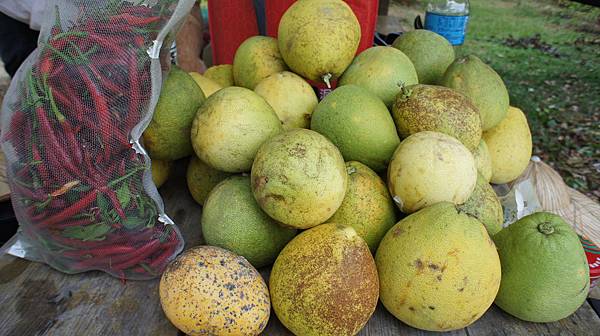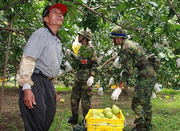 也有些老農認為現在還不到採收時間,採下來的文旦品質欠佳,對消費者不能交代,楊老農除認同其理也沒資格請國軍支援,只有跟颱風賭一把,若是受到颱風的影響也是天意。防颱工作還不能疏忽,把結果太多枝椏上已黃文旦疏摘部份免得吹折樹幹,金蜜芒果已黃熟無法再等,摘取眾鄰居分享,雖然很醜但滋味不亞於去年。