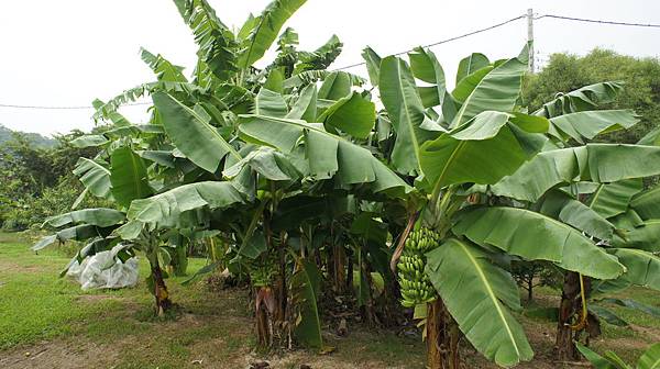 蕉園最怕風尤其十一株蕉樹上掛有近熟蕉,今忙著一串串加支撐,其實大風有支也撐不住,何況不知風從那裡來,支撐也是盡盡人事。