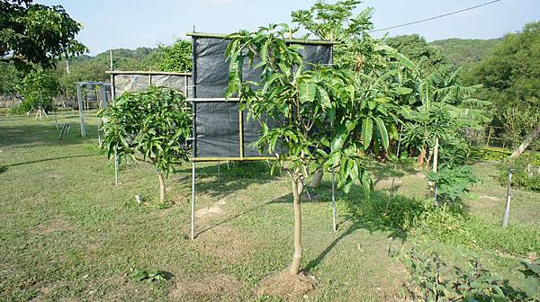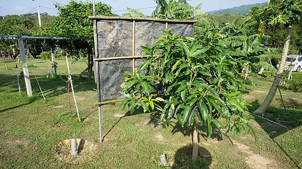 建防風長牆後東邊前兩排樹得免受東北風摧殘,第二線諸樹反而損傷更重,無奈之下只有再裝設鋼管柱擋風帆,小蘇建議為便於每年裝卸構建為活動式,在樹東北面相距6ft沖鑿兩孔,打入1inx3ft之PVC管為基樁座,風季時插上編紮好的風帆(統一規格),風季後也能輕易拔起保存備再用,管口略低於地面(照片左下為基樁座放大圖),未插帆時不影響割草等活動。去年衆賓推崇之金蜜芒果,初春時開花發嫩葉,被季風吹襲葉碎花落枝枯致今年無收成,今架上擋風帆期盼明年豐收享賓客。