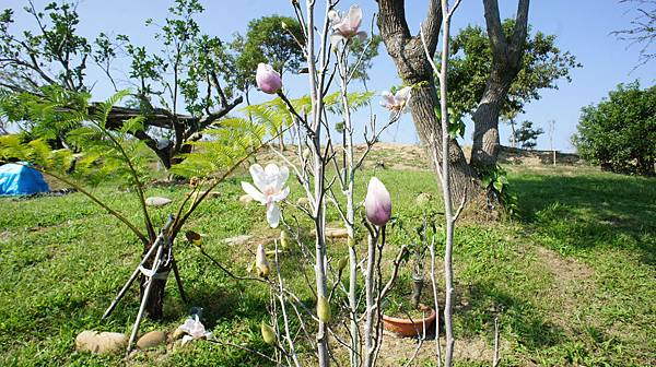 辛夷花俗稱木蘭花.紫玉蘭.望春花..,在為數衆多的喬木家族中率先開花迎早春,是第一位迎接春天到來的樹花,有“喬木春花第一枝”的美稱。年初旅遊瀋陽張大帥府,正逢辛夷花盛開,團友們都是第一次見此花,驚豔之餘打聽台灣何處有?告知春天農莊植有紅&黃兩品種並邀明春賞花。P園辛夷花夏月著蕾,入秋後茂盛的枝葉變成光禿的枝椏,不知為什麼時空錯亂,紅辛夷把秋末誤以為是春來也,今天突然全樹花開了。書上寫說辛夷花芳香豔麗,早開的花色淡.瓣薄.花小難稱艷麗,小蘇說好香我也聞不到。