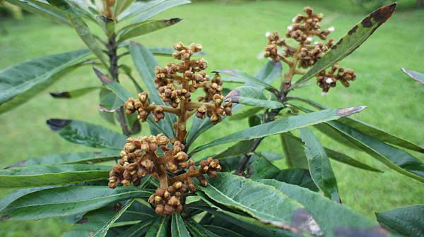 枇杷老師上星期天來指導疏花,因前一天田野老頭聚會以致週日未入園,惜錯失實地學習之機會,好在有留言函授,依指示先疏去下部2~3個側支軸,這是為便於套袋,這句話就是多少經驗之累積,我以前套袋時都必須先剪葉讓出空間,疏花後只保留中部的4~5 個支軸,前端頂芽包括花穗總軸全部摘掉,疏花的目的是限制花、果數,保留支軸基部的花蕾,摘除每個支軸末端的花蕾,每個支軸上約留4朵花。枇杷經疏蕾後的確清爽很多,落滿地花穗也有些肉痛,假如能每軸收10~20個果,也能收百多粒枇杷,收成時還要請老師來品嚐打分數。