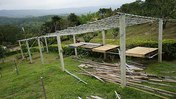 前文報告覓得曲線玲瓏葫蘆五個品種,Peter也贈予四種異形葫蘆-有單體細長柄、無柄形似淺盆、像天鵝戲水的,集世界之精華品種開春後種植,原有瓜棚3x6㎡不夠用,請小蘇再立柱.架管.拉繩,延伸加大一倍為3x12㎡,九個品種各一株還是會擠得一堆。農用資材木條.竹竿.管..堆放地面易腐蛀,雜草混雜其中無法割,順便於瓜棚下方懸掛置物床,一舉解決前述之兩難。