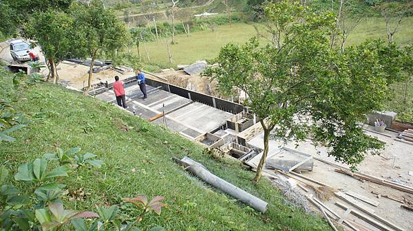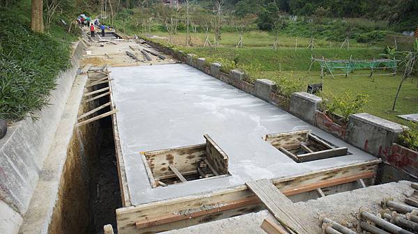 莊園幹道下建造沉砂池,第一座已完成頂蓋灌漿,第二座佈紮頂蓋鋼筋中,幹道施工重車在小農路穿梭,耽心壓壞路面及陡峭之基礎。