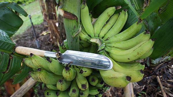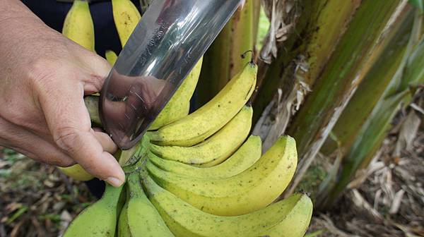 香蕉採擷改為熟時單支剪取,誠屬重大改進,能分散產期並得到樹上熟之最佳品質,只是不解其意者見單支蕉以為是剔餘品,要整把看起來才有價值感,曾嚐試各式刀.鋸.剪,狹窄空間多次損蕉傷手,終無法將直面繞蕉軸轉圓形,特製一隻圓弧鏟刀,貼蕉軸由上鏟下整把蕉。