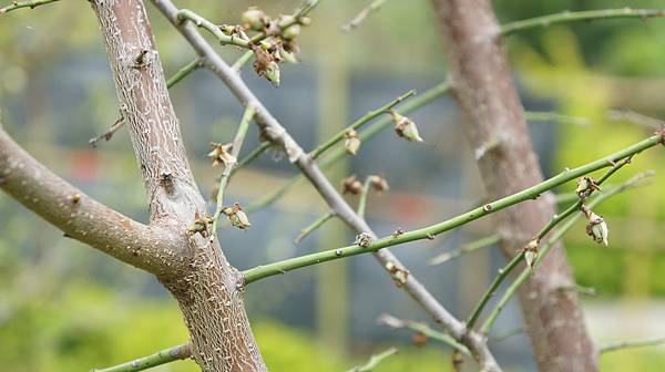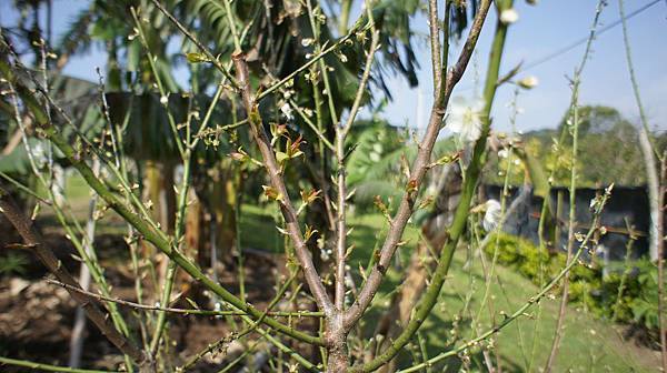 三冬前種兩株梅花一株小苗.一株已著花成樹,小苗梅花月前首次開花並結果已如黃豆大,成株梅花第三度開花滿樹,花落後立即新葉滿樹(結果株則未發葉),但卻從未結過一粒梅子,年底再開花前想選一枝幹試螺旋環剝,看會不會抑制發枝長葉轉而結梅子。