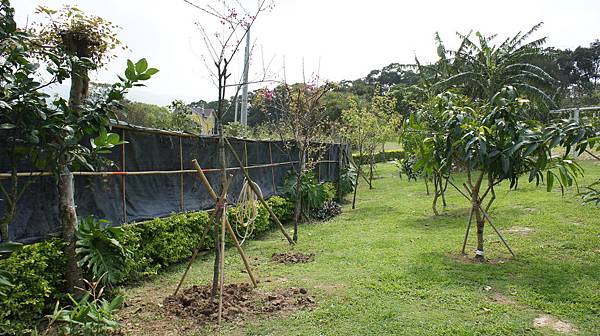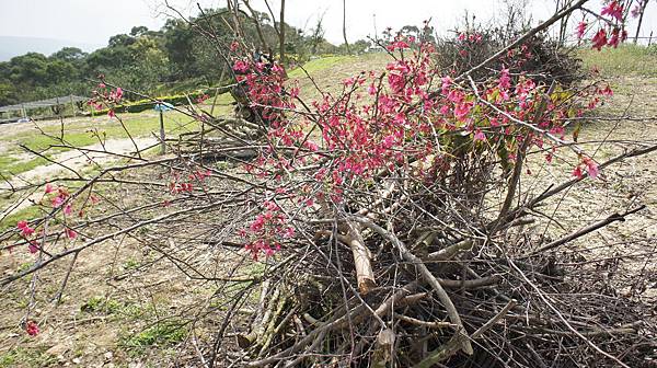開發公司在每戶路旁種山櫻花,P園路旁有兩株遭蟲蛀枯死,另有兩株大山櫻花孤立果樹區也不協調,原計畫待休眠末期移植路邊補成完整一排,最佳移植時機立春時節,提鏟到樹下發現滿樹花芽,即將開花下不了手,為觀第一次花拖延下來,如今花近尾聲再等將萌葉就不能移植了,今開挖盡量加大土球,為減少移植後水份蒸散及取其整排等高,花枝忍痛強剪下丟入柴堆。明春P園有整齊一列山櫻花,配合全社區道路兩側的櫻花同時繽紛綻放,道路兩旁無限延伸,享受山櫻.八重.吉野..花團錦簇的美景,景象想必十分壯觀迷人,假以時日賞櫻就不必飛日本擠武陵了。