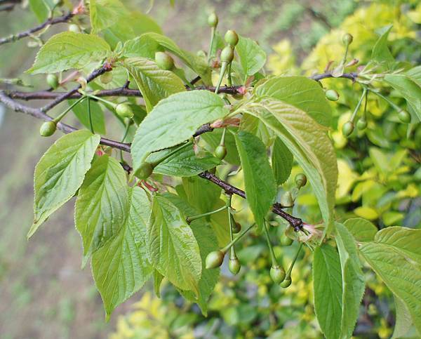 原本也想明年花謝萌葉前接上各品種櫻花,但山櫻花謝後結許多櫻花果,兩個月後成熟變紅,隱約葉間滿樹紅寶石,味道酸酸澀澀是小鳥很愛吃的小果子,也能醃製山櫻花果蜜餞。櫻花可分單瓣和複瓣两類,山櫻.吉野單瓣能結果,複瓣類花蕊分化成花瓣就不會結果。綜觀得失再思之後決定 - 還是保留台灣原生種山櫻花,一則易栽培,再者一年兩度觀賞還有實質收穫,況且賞櫻花本是遠觀其量大就是美。
