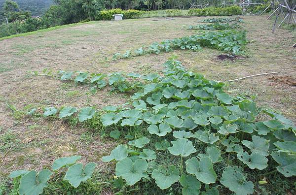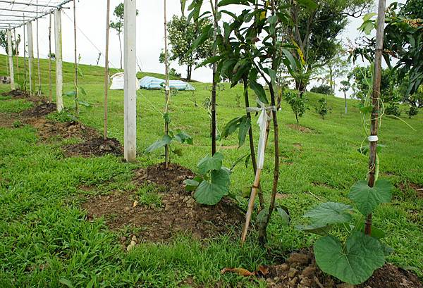 一個月前於台地種的西瓜、南瓜、蒲瓜,它們也都長得強健並且開花結果,只是小瓜都被蝸牛吃破相。