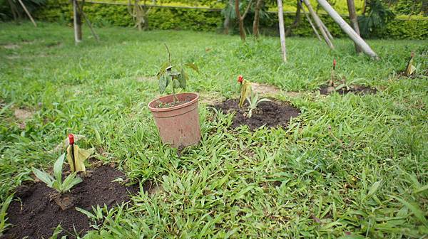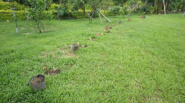 Peter C糾正我耳誤Jewel為Pearl,所以原稱珍珠塔要更名為-「Tower of Jewel」「珠寶塔」,珠寶塔苗趁近日梅雨季陰雨天氣,出盆分植於東面第一崚線,每2Ft一棵共栽種卄棵,假如都順利成長「珠寶路」一定美麗壯觀。因苗太小尚不及草高,怕被來客誤踏,於株間放花盆並插上小黃旗,沒想到原標示那棵樹已澆水識別旗,兩年未用還有剩餘價值。