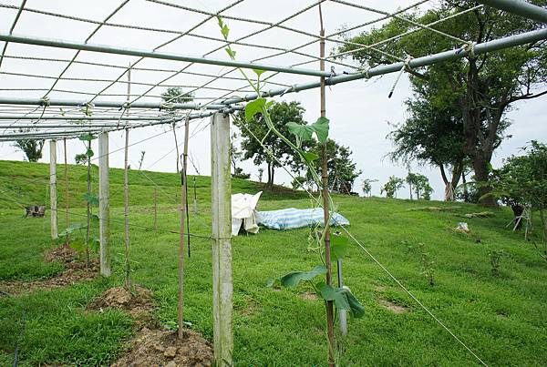 葫蘆種子發芽率不到一成,還有些品種掛零,但育成的到是生長快速又強健,向上長期間側芽及花蕾一律摘除,為希望早登棚架,已一如預期攀到棚頂,接下來就可看到想像中葫蘆美否。