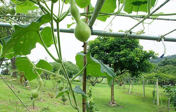 葫蘆都已攀登棚架頂,紛紛開花結果,天鵝形葫蘆長得最快,可意會出嘴.頭.頸.身各部,只是要如何盤出戲水樣?如任其發展可能會像隻菜市場掛鴨。