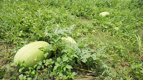 兩難之下無可奈何只有頂著烈日慢慢拔草,沿瓜藤一棵一棵挖草掘根,辛苦半天頭曬昏.人累壞.手起泡還作不到卄坪,抬頭看看百坪草深過膝之瓜田,又急又氣又難過,想以手工拔草保全瓜實,是癡人作夢不自量力,只得背起割草機用機器割,草下隱約見瓜葉者割葉上長草,不見瓜藤蔓則貼地割,如履薄冰慢慢進刀,仍割斷許多瓜藤又傷瓜,也不知有多少成長的瓜被割斷主藤而報廢,機割雖說快割時心驚膽跳,割完心痛不已。