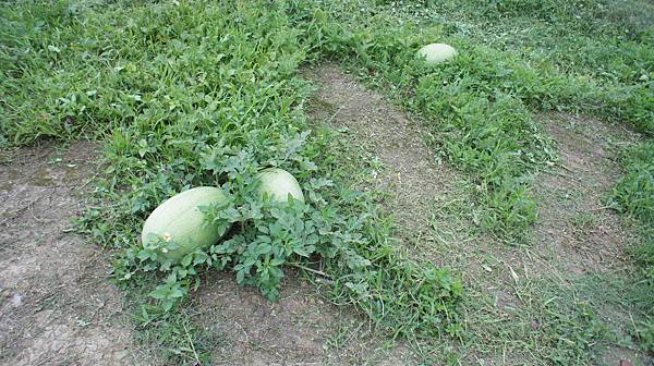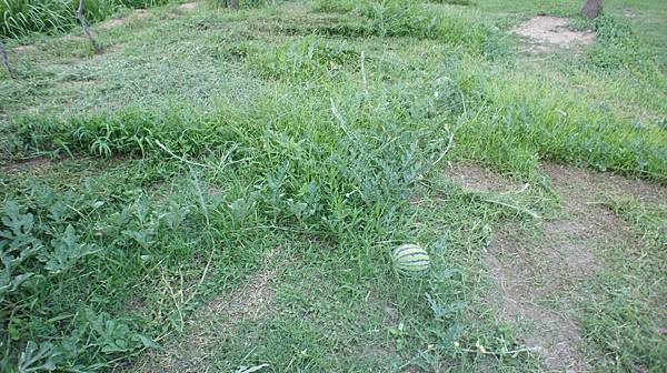 西高台地初春油菜割後買些瓜苗種植,有各種西瓜.蒲瓜.南瓜,原意為採「自然栽培法」不計收成,計劃任隨瓜及草自由競爭,就當水土保持及綠肥作物,使土地多些有機質。初期瓜藤蔓與雜草混雜覆蓋地表,今年多雨確有水土保持之效,但至今雜草既多又高,已淹沒瓜葉,更糟的是雜草以鬼針草最多,且已開花結實,如不立即割除恐其漫延已淨化之果園綠地,全面割除又捨不得結實纍纍待熟西瓜,以及蒲瓜.南瓜月來連續摘瓜收穫頗豐,真是左右為難。