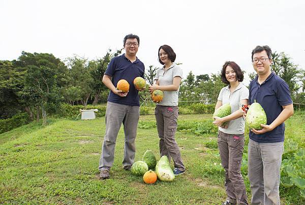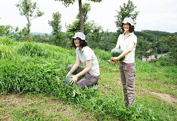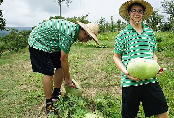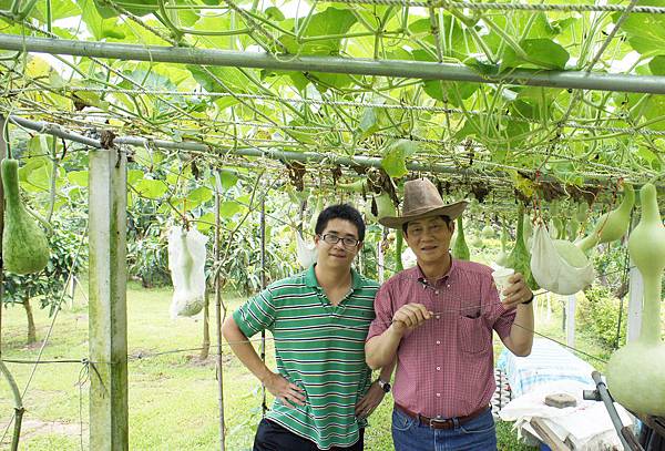 春天農莊立園三週年,L.R.O.P園聯合辦歡慶,九弟.子.女.姪.孫齊集同樂,午餐筒子雞及各式燒烤美食,P園兩個大西瓜熟度剛好甜脆好吃,南瓜蒲瓜收摘,觀賞各式各樣美葫蘆,九弟.姪孫後是新結之長柄葫蘆。