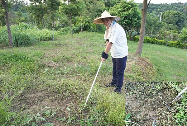 到國光花市農具店找刮草刀,不但有小蘇介紹之花生田用短刃鋒利鋤,還有各種寬窄.厚薄.長短柄刮草刀,選擇了包心菜園用刮草刀,三角形是為可伸入包心菜下方,刃口利輕便長柄正符合刮割瓜藤蔓下雜草,迫不及待入園先試寶刀,能夠伸入瓜藤下方刮草,也可以吃入地表土下切斷草根莖,但是還不夠鋒利,必須非常用力,小暑節氣36℃大熱天作幾分鐘就喘噓噓。