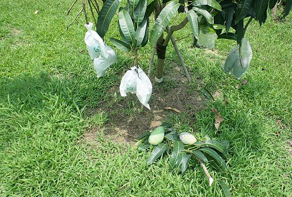 種植了七.八種芒果雖都開花,但只有紅龍芒果結實累累,一路來還是多災多難,雨水太多被脹爆幾粒,眼看越來越大已近成熟,今又發生果太重壓垮枝幹。