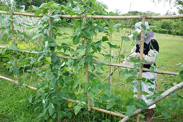 P園擋東北季風帆架,王夫人利用拆帆空架期種幾株長豆攀附,現開始收穫長豆,又有一陣子要天天吃長豆了。