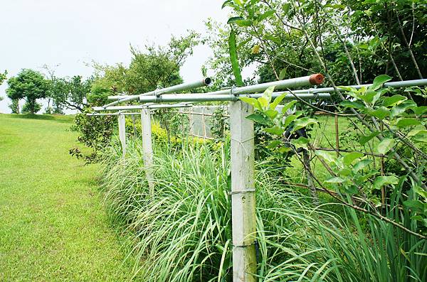 認為火龍果是沙漠植物不需水及肥料,多年來都不見成長,請教專家才知火龍果需重肥,喜含腐殖質的肥沃壤土,改弦易轍施肥後果然快速竄長,已高於水泥柱了,請小蘇在三根柱頂搭棚架,主枝引上横桿後,再長之分枝由兩側垂下,只有下垂枝才易萌蕾開花,便于採摘和管理。