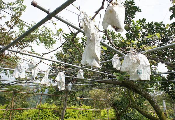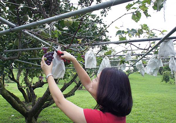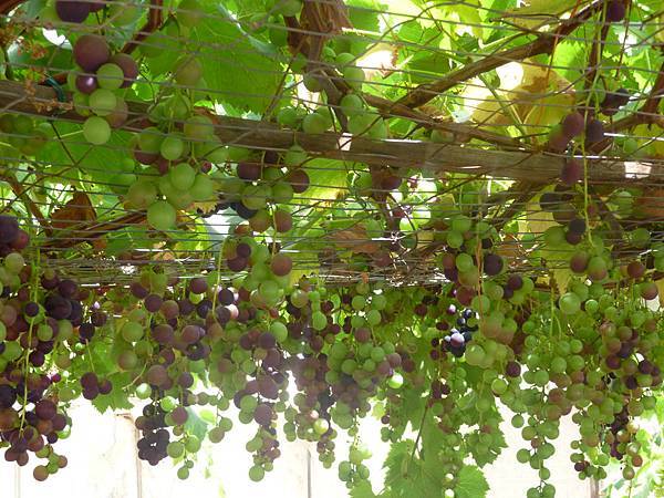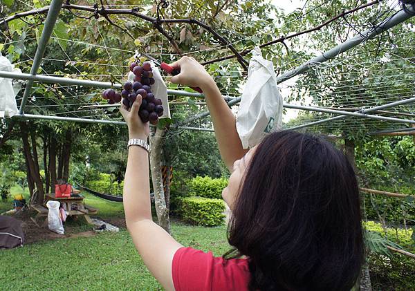 五年前帶給Peter C之巨峰葡萄,每年豐收今年更掛滿架(第一張照片),並告知:「要等果色變黑時,結實有彈性果粉香氣濃郁,品質口感最佳」。P園葡萄今年結果超過卅串,為等果色變黑一直捨不得摘,只有颱風後女兒來摘了兩串,近日來發現葉子掉落,套果袋扁扁隨風擺,拆開檢查已經變成葡萄乾了。颱風雖未將葡萄吹落,但果梗.葉柄已傷致葉落果乾,苦等白露待客佳果又泡湯了。
