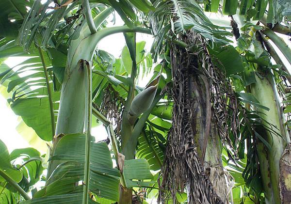 芭蕉樹高收摘時由樹幹中間切開放倒,半截殘株保留希望其莖幹水養份供應其仔株,照理其已無生長點會慢慢枯竭腐爛,居然有一桿抽芽發一小葉就長花蕾,只是二度蕾極瘦弱,讓它去長看有何結果。