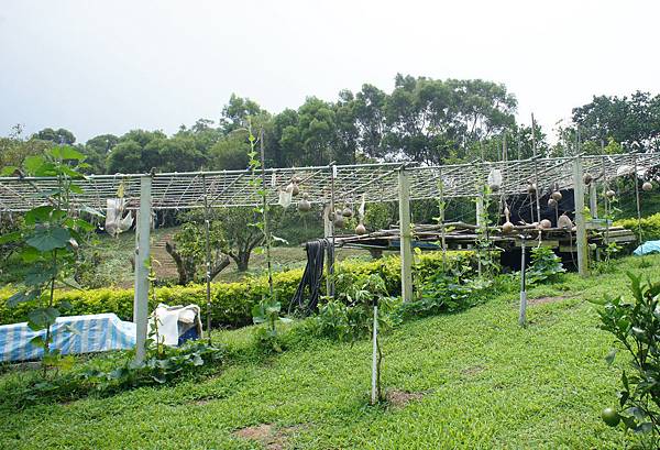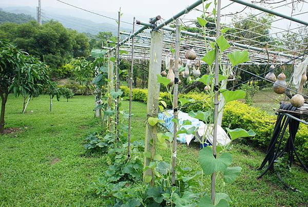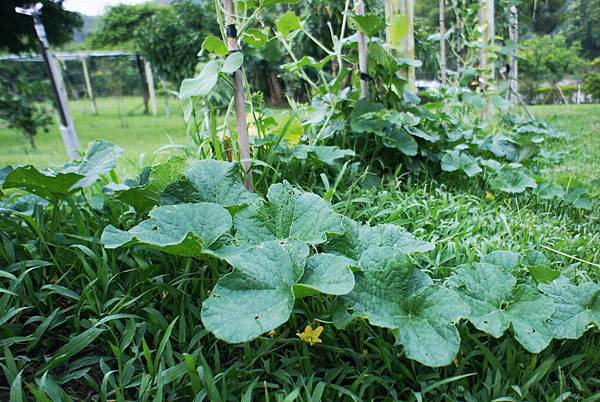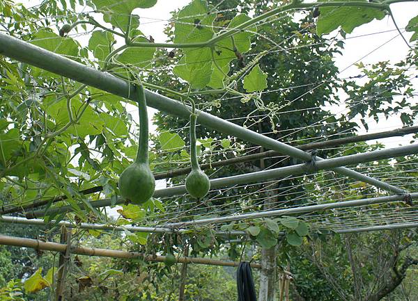 首批葫蘆四月初定植,因出芽率差末批六月才移植園區,但遭颱風僅葡萄架邊幸存一株,近來結了三條長柄葫蘆。