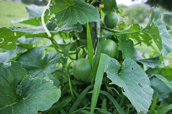 葫蘆枯死想利用棚架閒置期種些美濃香瓜,但才攀呎許高又須讓位新萌葫蘆苗,將藤蔓折返向下,有幾粒瓜懸空長,先上再下意外發現也有優點,以往瓜&草同時起跑都是瓜不敵草,如今等瓜葉強健再蓋回草上就強弱易勢了。