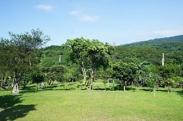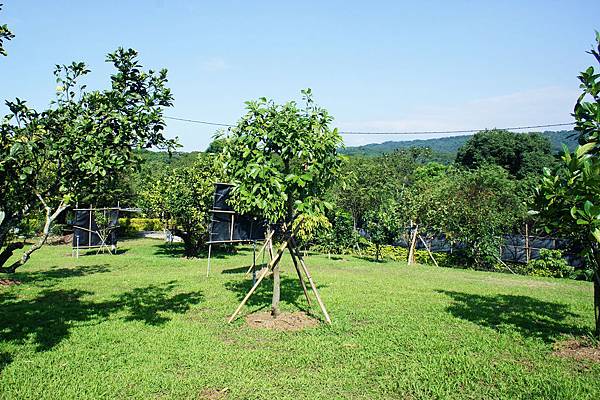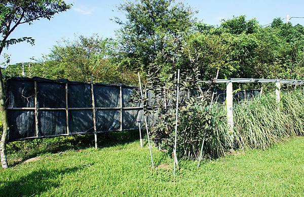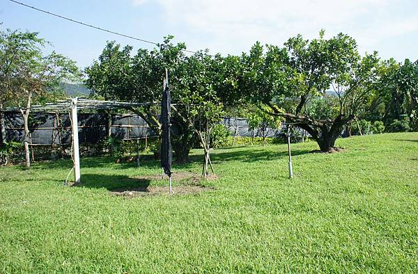 年度盛事文旦成熟採摘,貴賓分批光臨賓主盡歡,已將最美的景觀呈現親友,喜樂之後觀瞻退居其次,保護植栽為首重,架起醜陋防風網,對抗為期長逾半年的東北季風,委請小蘇將東面及北面數十公尺遮蔽蓆鋪紮上架,活動式擋風帆再立園中,去年印證確有實效,也就顧不得美觀及妨礙割草機運作了,未雨綢繆期盼明年園美果豐收。