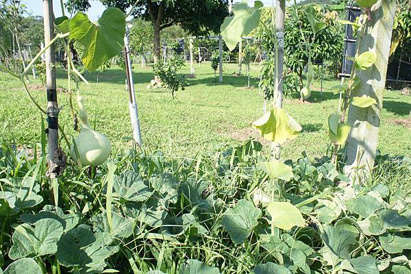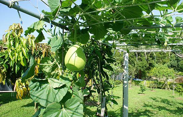 6月暴雨肆虐滿棚葫蘆枯萎,為保護瓜棚架下儲存器材.肥料..免於曝曬損壞變質,先後種植蒲瓜.香瓜.葫蘆...陸續開花結果。特地保留待客之香瓜週日忘摘,今鄰居分享果肉粉粉味極甜,秋葫蘆料想不可能成熟殼硬,準備當菜蔬食用,現在大小老嫩應該正符合食用,還是捨不得下剪,只摘幾個蒲瓜就夠我天天三餐全吃瓜。