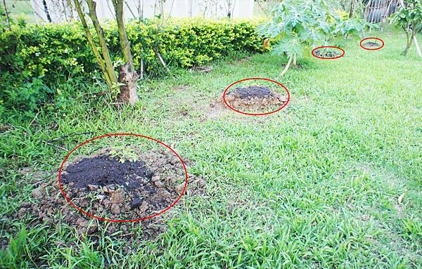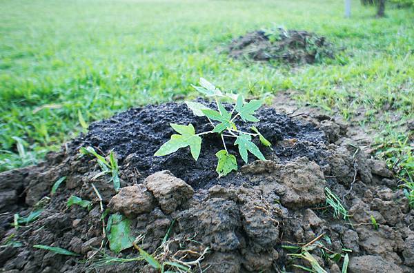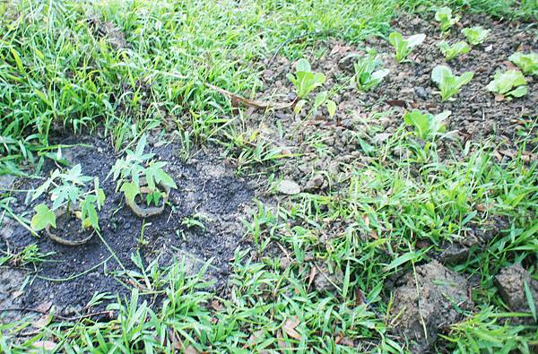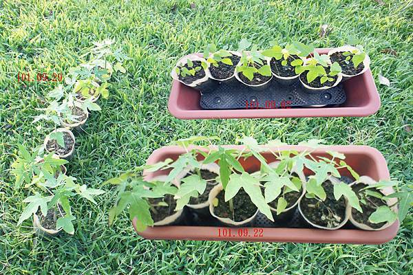 東南亞大木瓜18粒種子,分六盆各置三粒,發芽率高很成功,每盆至少發兩芽,汰弱留強每盆一株,迄今已逾兩個月,今出盆定植園中。六月豪雨木瓜樹被泡死的前車之鑑,挖掘植穴.扮基肥.運土作高畦防淹, P園中種植四株分與O園兩株,唯O園諸農全部請假,不知其打算種何處,暫時連盆假植於菜畦旁。