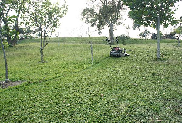 為農後不曾有過逾一個月不割草,草實已黃草長淹腳目,機器回來立即上陣割草,見草屑源源不絕大量噴出頗有成就感,千里馬半日剪完八百坪。