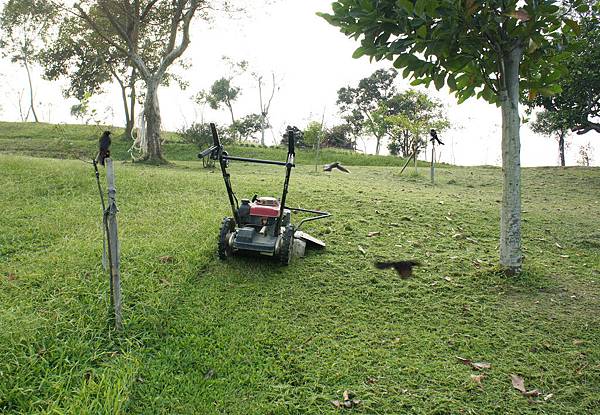 初為農時園中常見鷺鷥.鵪鶉.麻鷺漫遊,割草總有群鳥四周相伴,但已很久無此鳥伴榮景,今卻又有十餘隻烏鳩伴隨,不時低飛於機器上方,豁然明白要草長才有蟲棲,兩年來為美觀及怕草長藏蛇,每兩週割草一次,草短無蟲水清無魚原來鳥也知曉。