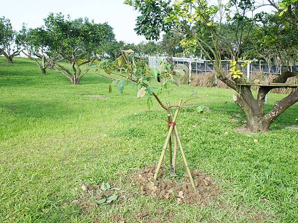 珍珠芭樂當初種植時鄰近株距都在4米以上,但因蕉園擴充現已隱藏芭蕉叢下,必須遷移有陽光處,為求保全生機不傷根,附留較大土塊,但自不量力土球太重搬不起來,想要用圓鍬兜底翹起,用力之下芭樂樹未起,圓鍬手把折彎了,還得求救請小蘇幫忙完成移植。