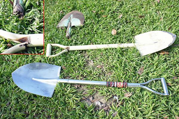 這是為農三年用壞第二把圓鍬,第一把木柄折斷,第二把鐵柄從手把處斷裂,看斷口因已銹蝕在先,知錯再改買把最貴的不銹鋼圓鍬,就不知道可用多久又會從何處損壞了。