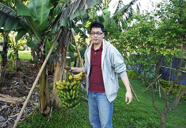 九弟媳及倫姪長居加拿大,今天還是首度蒞臨春天農莊,香蕉在眾賓雲集時黃熟一串,邀倫姪親手割摘。