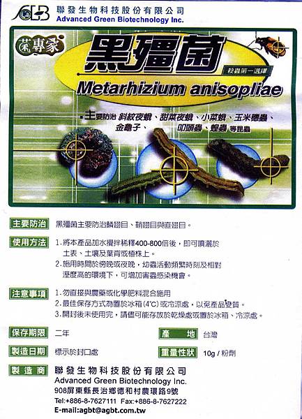 農委會農藥毒試所利用天然生物製劑,研發出屬真菌類之黑殭菌,所含之菌種是由自然環境中所分離之菌株,因此對人畜並無傷害之慮,且無農藥殘留之問題,適用於無毒的農業栽培上。黑殭菌是能使昆蟲致病的真菌,用於防制天牛等蛀幹害蟲、蠐螬等地下害蟲、小菜蛾(吊絲蟲)、玉米穗蟲(青蟲) 、金龜子(雞母蟲)、叩頭蟲(金針蟲)、蝗蟲以及蘋果食心蟲等,並且對蚊子幼蟲有效。黑殭菌對人畜十分安全,並且不影響生態和食物鏈(天敵也無影響)。黑殭菌對害蟲皮膚感染,真菌接觸到蟲蟲時會鑽進蟲蟲體內,真菌一方面分泌真菌毒素,破解蟲蟲的免疫系統,一方面吸食蟲蟲的養分,蟲蟲接觸到真菌後,使分生孢子在昆蟲體表萌發,並藉由芽管侵入蟲體內,從而使昆蟲被感染,真菌便會在蟲體一步步啃噬,約五到六天自然死亡,全身呈黑色如同發黴般。這種特性對於防治刺吸口器害蟲或土壤害蟲更為有利。黑殭菌可藉由分生孢子的傳播,於田間形成有效的重複感染源,長期施用下可降低作物害蟲族群數量,減緩蟲害的發生。