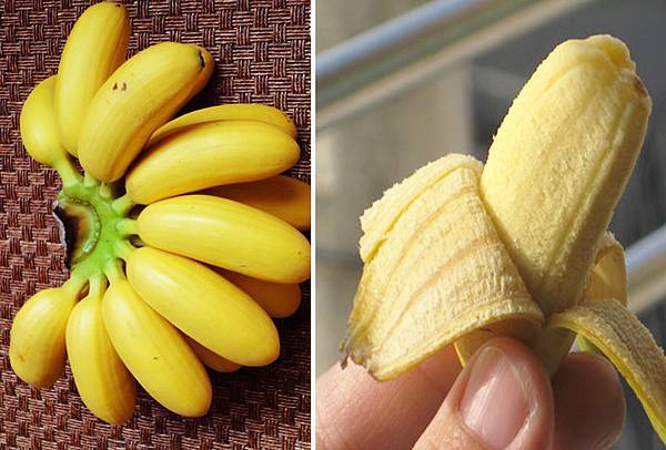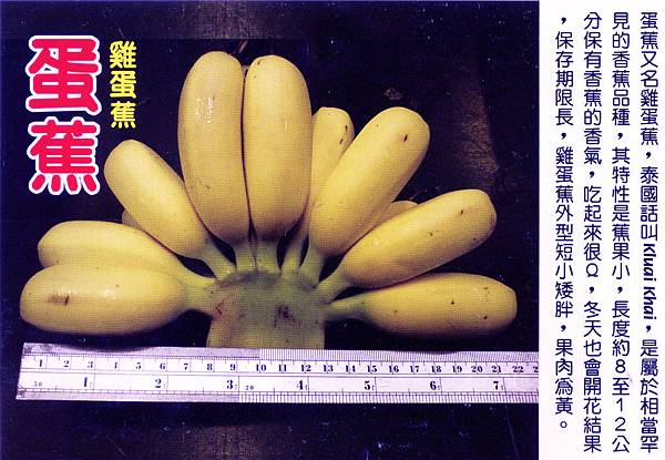 蛋蕉又稱一口蕉其特性是蕉果小,果皮極薄肉質軟滑橙黃色甜度高帶香氣,台灣香蕉研究所自泰國引進栽培,植株高度約達3公尺莖周約60公分,生育期11個月,單株平均產量約8公斤,其蕉株質地脆弱不抗風,易受風害而折葉、折株或倒伏,P園現植芭蕉及矮蕉已難敵強烈東北季風,就不知蛋蕉能熬得過否?
