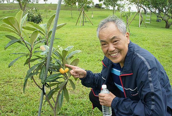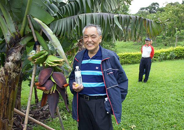 Mr.Yuan與Peter.C是同班同學,農業科班出身又有大農場實作經驗,Peter陪同首度蒞臨指導,見有些樹葉前端焦枯,直言是施肥過度,真是專家所見相同,今年五月之追肥施量將減半試看,被教授之知識還須自己實際體驗,使之變成自己之經驗,才能昇華為能活用的智慧。專業大農面對種植各類果樹之雜園,不知從何教起,客氣的只稱讚香蕉花碩大如蕉,請專家親摘四粒黃金大枇杷待客。