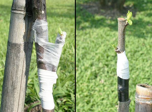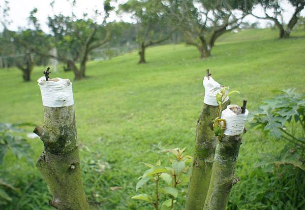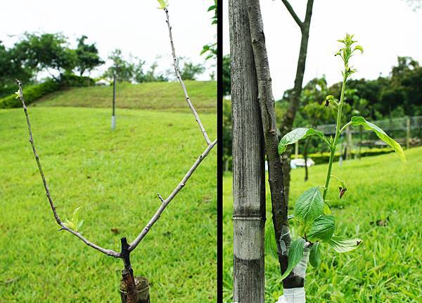 三月底Peter接兩芽藍李子,先採最常用之「切接法」,但因砧木劈口會深裂,改以較難固定之「對接法」,接於砧木頂端,另一芽則在楊老農去年自接藍李(已萌新稍)之砧木中段,以難度較高之「腹接法」接上一芽。標準接枝作業自嫁接日起算,接點癒合時間約需一個月,長出新稍要兩個月,新稍成熟至可見新芽點得等三個月。但Peter接枝兩週就萌芽,至今才40天新枝已4in有葉十餘片,可移除膠袋脫離高溼弱光保護環境,開始接觸自然自由生長,目前有兩株樹三枝藍李子了。提前宣告嫁接成功!