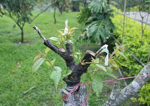 年初將加拿大櫻桃接枝於山櫻,牛樟接枝於土樟,仍是全軍覆沒無一存活,我接枝數十芽99%失敗,而Peter成活率永遠百分百,正如當紅廣告詞-"同款兜無同師傅咧 "。接枝失敗之砧木也只得讓其出芽恢復生長。Peter老師謙稱:「可能是恰好正逢萌芽發動時機,樹液開始活動容易存活。並建議新手不要接於老幹,木質太硬難密合,明年萌芽期前選充實飽滿接穗,再試接於一年枝砧木較易存活」。