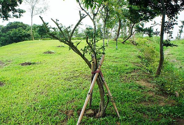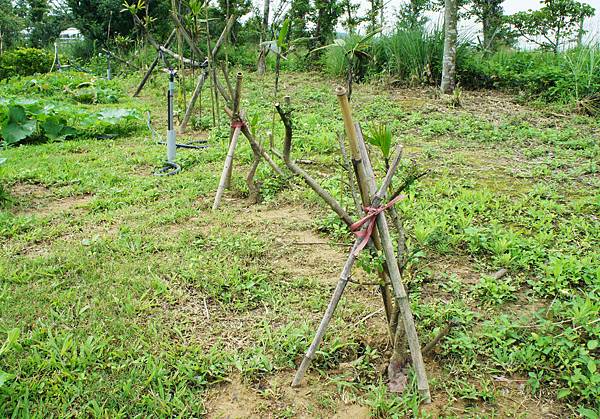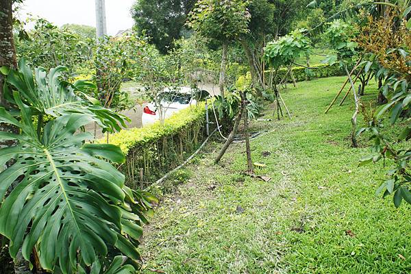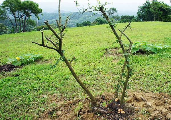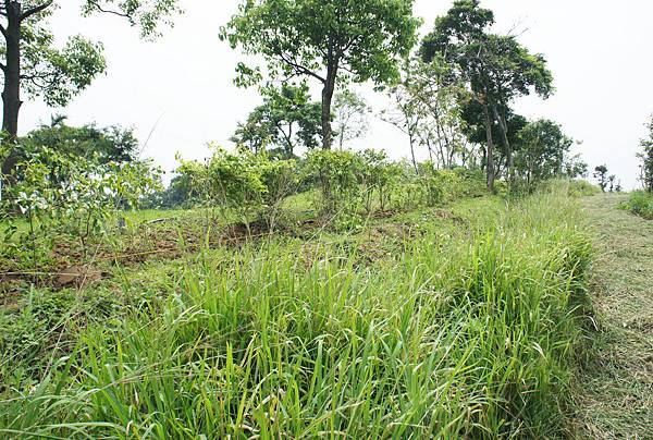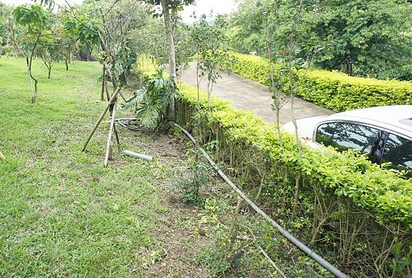 社區開發時路旁及各區塊界種植金露花,如今長成茂密美麗樹籬,P園東側路旁植三行帶狀陣列,成長後樹籬厚度超過1M,自種果樹也長大顯得雜亂擁擠。西側是社區外圍與鄰地之交,當初未植界籬,請小蘇將東側挖出一行,移植於西側界,這名副其實是「挖東牆補西牆」。據老地主告知:「與西坡地界古早時是以天然崚線,西坡地主畜牧養牛,沿曲折崚線整地推低2m,取得平緩坡植牧草放牧,又有陡峭土牆防牛隻出走,故與西鄰是以高低分界。」現今地政測量釘界標拉成直線,變成界線有的在坡頂也有山坳坡腳,小蘇拉繩退回1ft種金露花,種高植低還有的要栽於陡斜坡牆中。