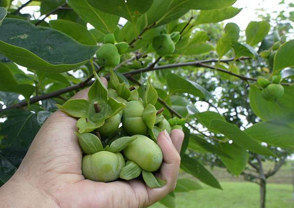 前文報導巴西櫻桃及次郎柿子種三年得地氣,得地氣年會首結幾粒果報訊,隔年開始大量結果,巴西櫻桃千粒掛滿樹,次郎柿可愛小果百餘粒,日前忍痛將每枝4~5粒疏為2粒,今再梳成每枝1顆,秋後會有卄四顆嬌艷紅柿高掛吸睛。
